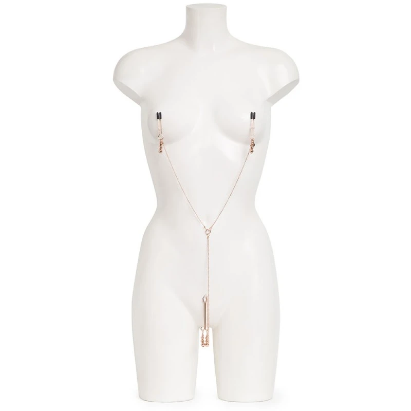 Cette accessoire de bondage de couleur or rose est conçu également pour contrôler le clitoris de votre partenaire. Les 2 pinces tétons sont recouvertes de silicone pour un maximum de confort et sont aussi ajustables.