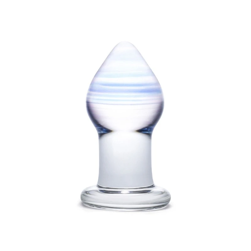 Entièrement en verre, ce plug anal est un très bel objet de plaisir… Lisse et brillant, il est décoré de fines lignes bleues incrustées dans le verre lui donnant un aspect très esthétique.