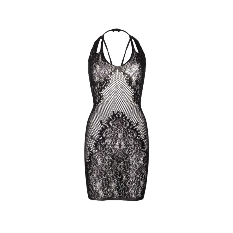 Portez cette robe en fine résille, aux motifs en dentelle noire et élégante pour offrir à votre partenaire une vue à couper le souffle ! Un laçage ouvert descendra le long du dos jusqu’aux jambes révélant ainsi vos fesses pour rendre complètement fou de désir votre partenaire. Moulante et semi-transparente, elle mettra vos formes en valeur.